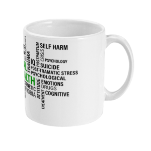 Mental Health Wordcloud coffee mug helping to spread awareness with every sip.