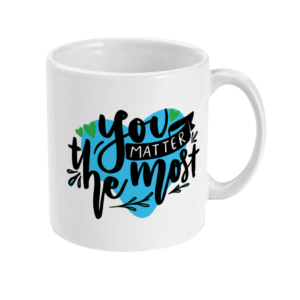 You Matter The Most coffee mug featuring blue and green hearts in support of mental health awareness.